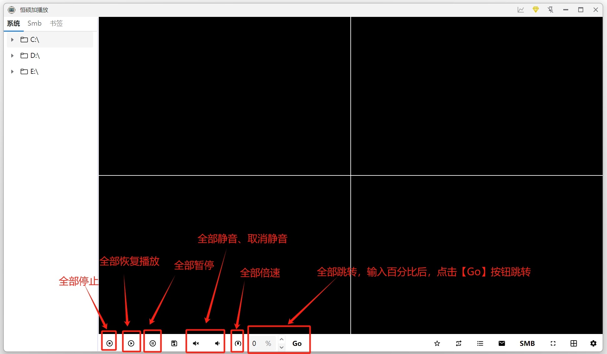 支持多个批量操作。如:同时播放/暂停、同时跳转、同时静音/取消静音、同时倍速、同时停止、同时快进等